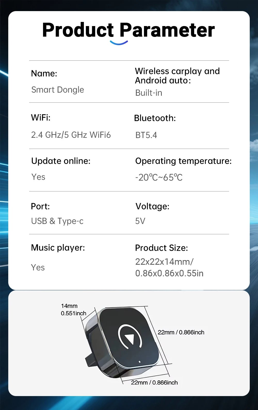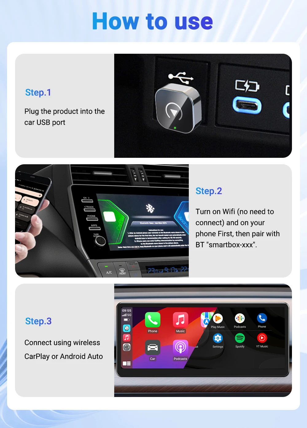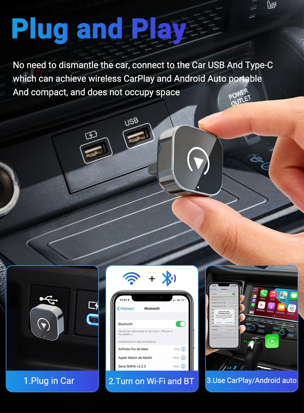 No need to dismantle the car, connect to the car USB type-C which can achieve wireless CarPlay and Android Auto portable and compact, and does not occupy space.