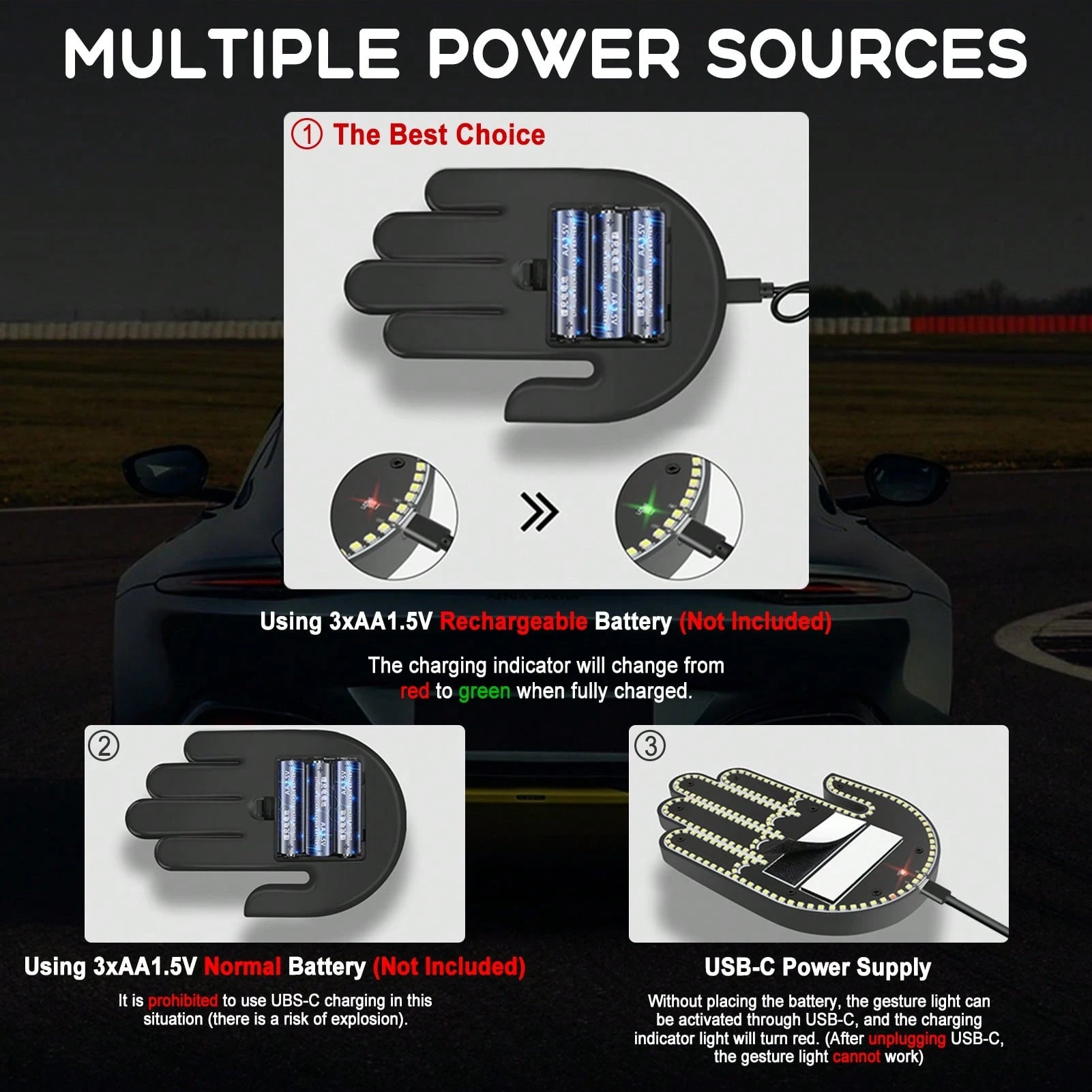 - 【Gesture Finger Light for Car】:This hand gesture light immediately showcases your personality to other drivers in a safe and fun way. Includes 3 gesture modes that can be freely selected according to needs. This car gesture hand light helps to remind and attract the attention of other drivers, or express your love or gratitude to kind drivers.